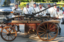 Ročna brizgalna na vozu, v katero je bila vprežena konjska vprega s posebej prirejenimi sedeži za moštvo in potrebno pripadajočo opremo, z karbidovko za vožnjo ponoči.